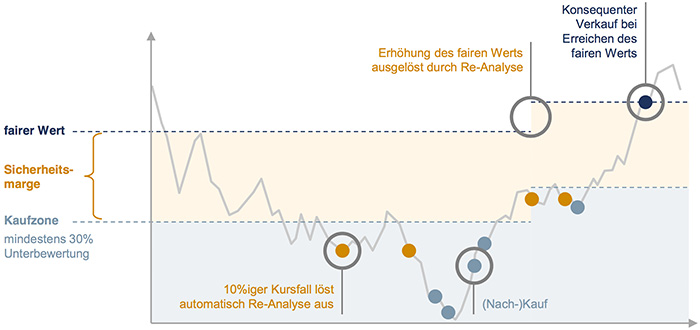 Die Aktienanalyse besteht aus zwei Teilen, die im Zusammenspiel miteinander durchgeführt werden: eine fundamentale ökonomische Analyse zur Bestimmung des Unternehmenswertes und eine qualitative Bewertung des Geschäftsmodells. Hierbei wird der Unternehmenswert mithilfe von Barwertmethoden, Liquidationsmodellen und Kennzahlen bestimmt und mithilfe der qualitativen Analyse auf Plausibilität überprüft. Dabei sind die wichtigsten Faktoren für uns: die Wettbewerbsposition, die Managementkultur, die Preissensitivität der Produkte, die Bilanzqualität, die Branchenattraktivität, die Markteintrittsbarrieren, die Liquiditätsanforderungen und die Eigentümerstruktur.